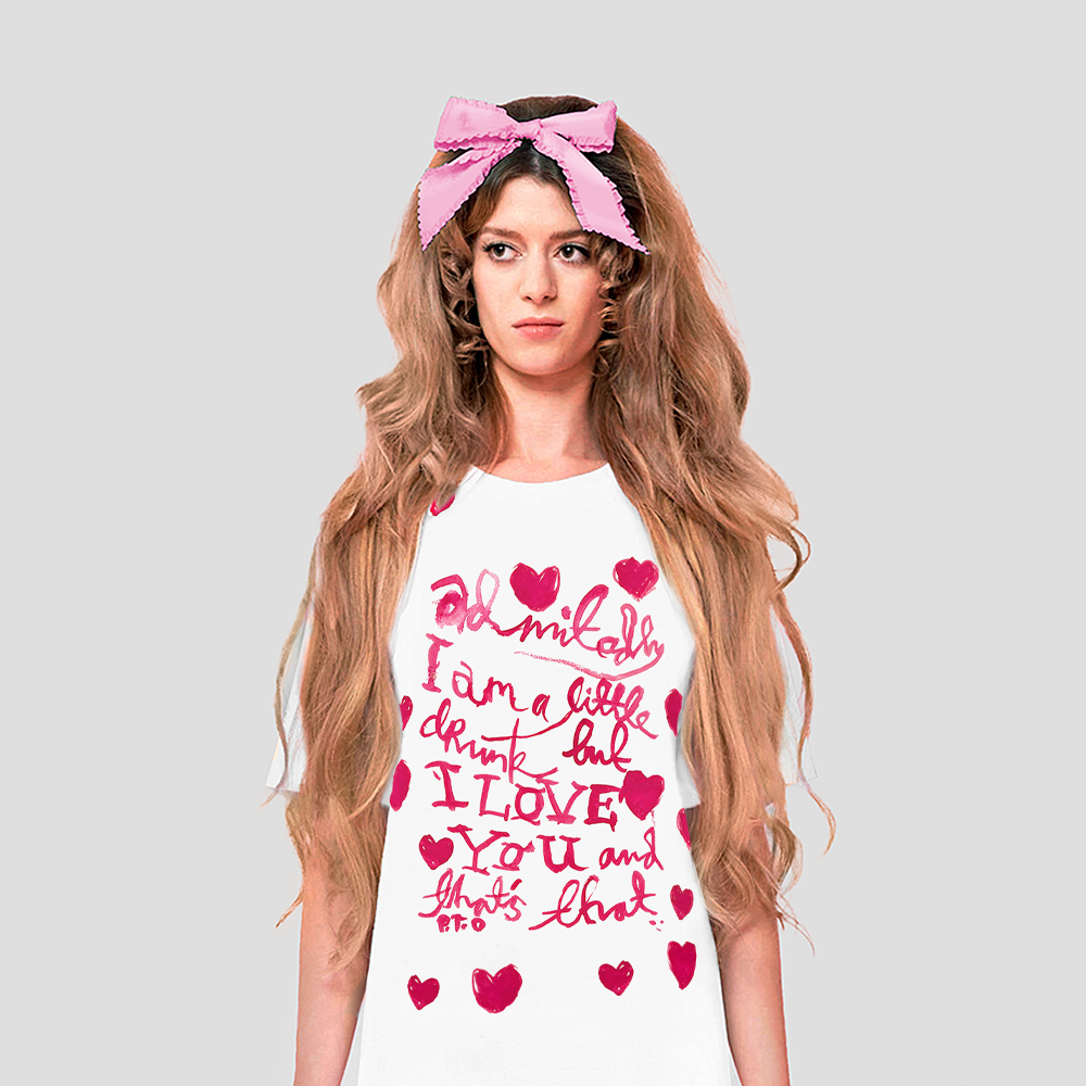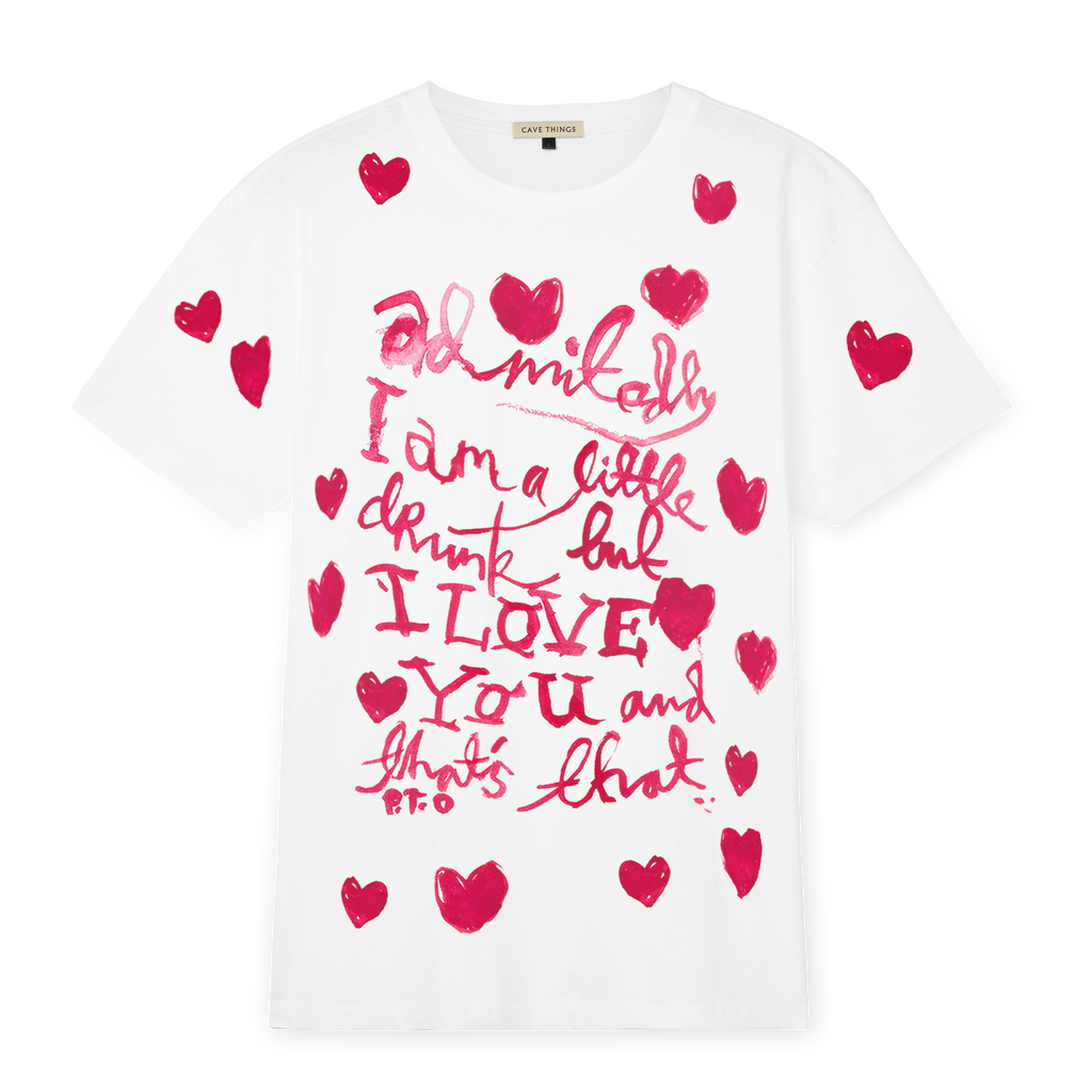 Romantic t-shirt featuring note from Nick Cave to Anita Lane: ‘Admitadly I’m a little drunk, but I love you and that’s that’. This design is also available as a notebook and a tote bag.